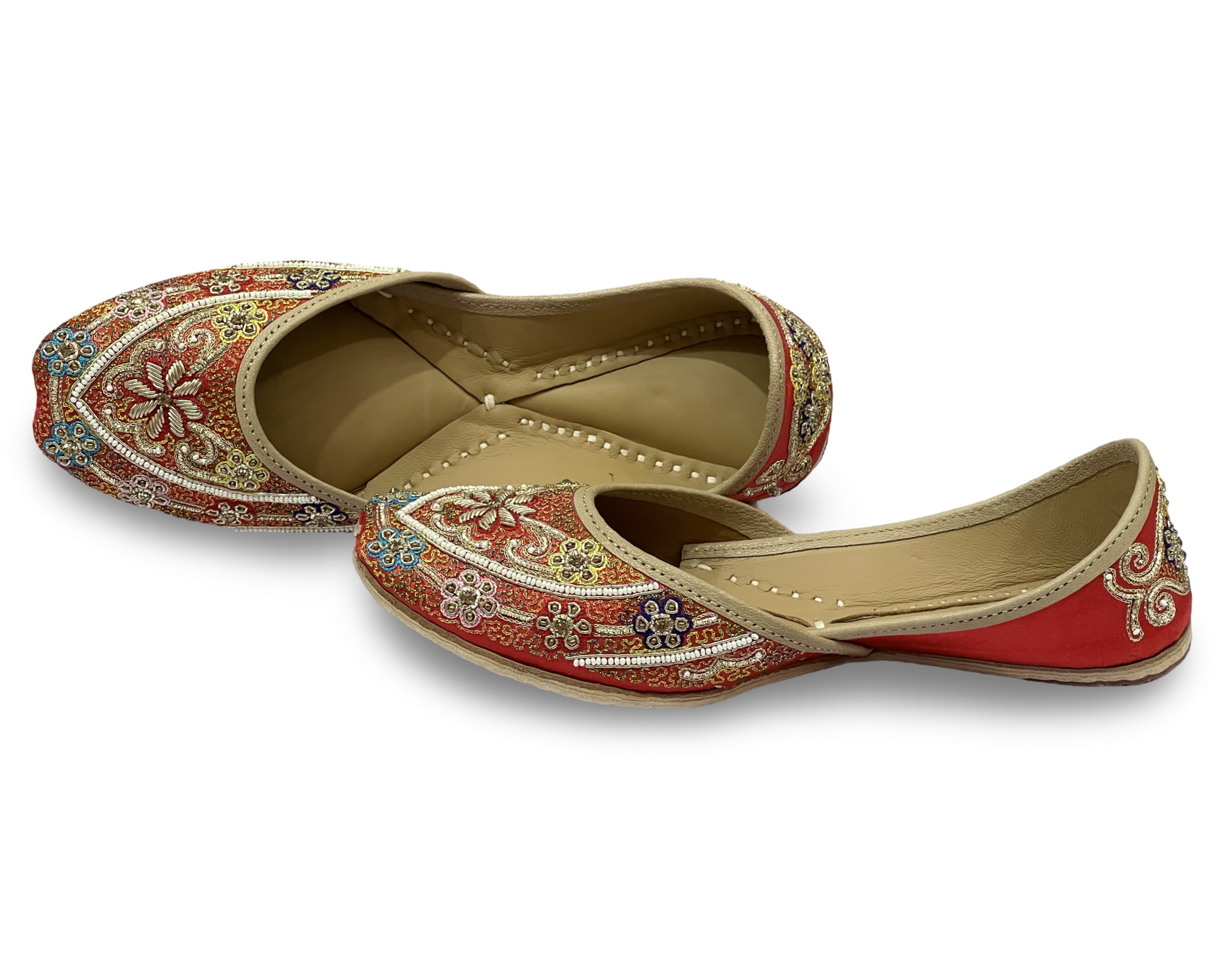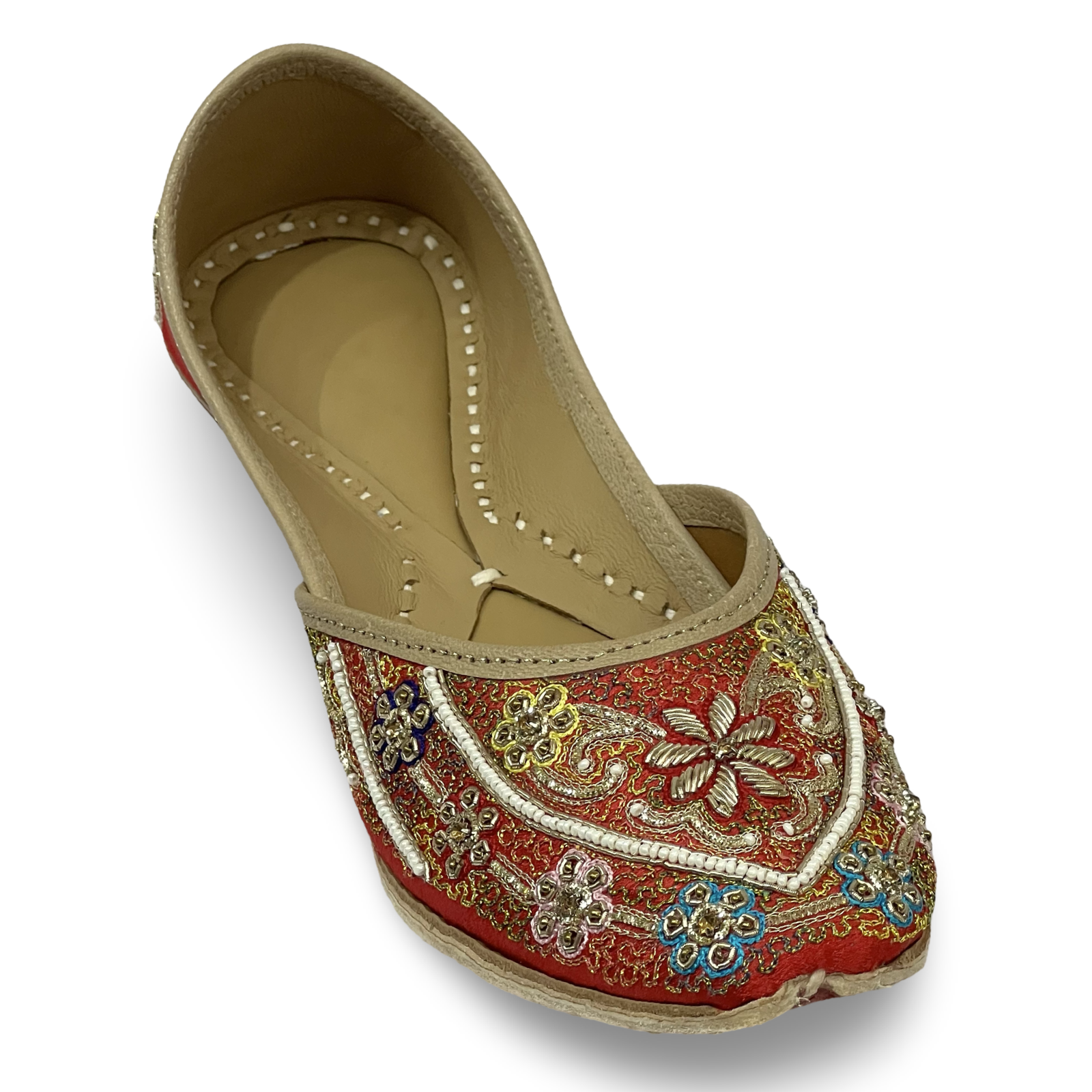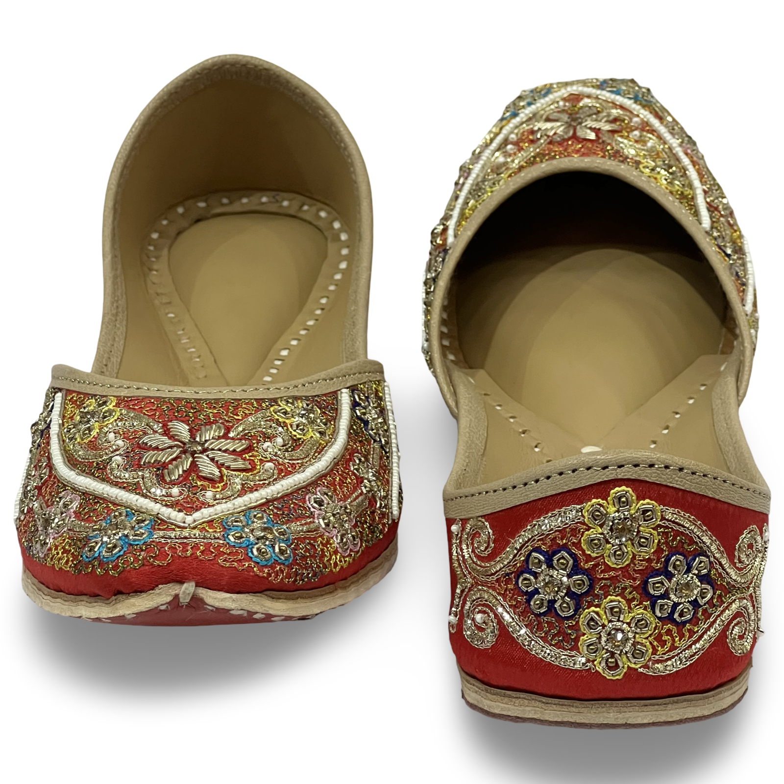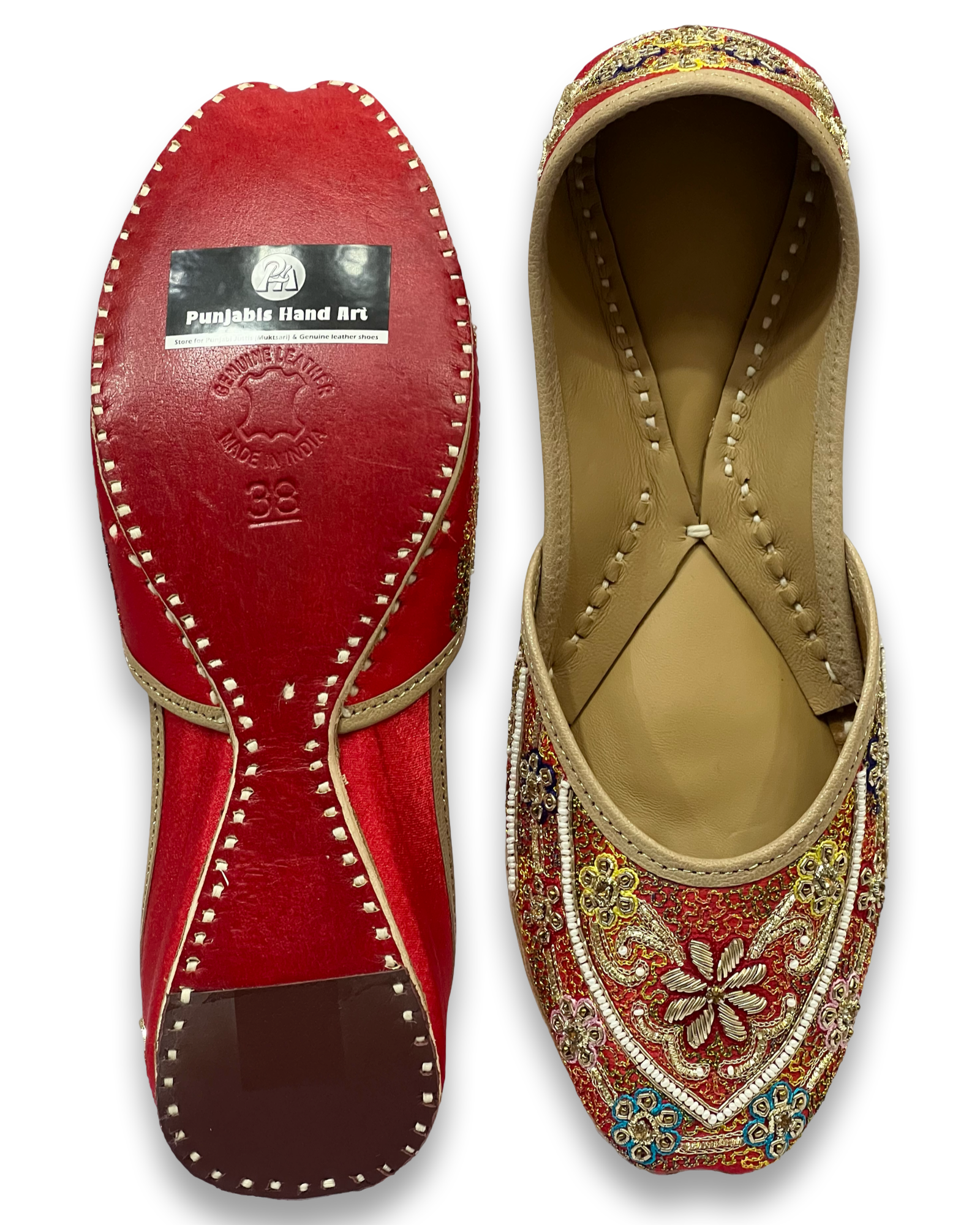 Step into elegance with these exquisite handcrafted ballet flats, featuring stunning traditional jutti styling. The pristine white base serves as a perfect canvas for intricately embroidered burgundy and pink floral motifs, complemented by delicate green leafy details. Each shoe is a masterpiece of artisanal craftsmanship, adorned with beautiful thread work and subtle beading that catches the light. The comfortable slip-on design features traditional jutti construction with a rounded toe and leather sole. The tan leather trim adds a sophisticated finish while ensuring durability. These versatile flats pair beautifully with both traditional Indian wear and contemporary outfits, making them ideal for festivals, celebrations, or everyday wear. The cushioned footbed provides comfort for extended wear, while the authentic handcrafted nature means each pair carries slight unique variations that make them truly special. These juttis represent the perfect fusion of traditional craftsmanship and modern style.